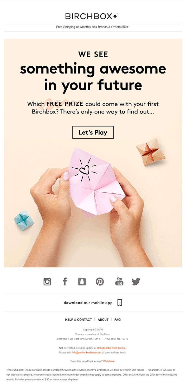Not only do people love free things, but they also love surprises. By making promises of a “free prize” to be won, beauty company Birchbox gives the user a compelling reason engage with their email, and click on the link.